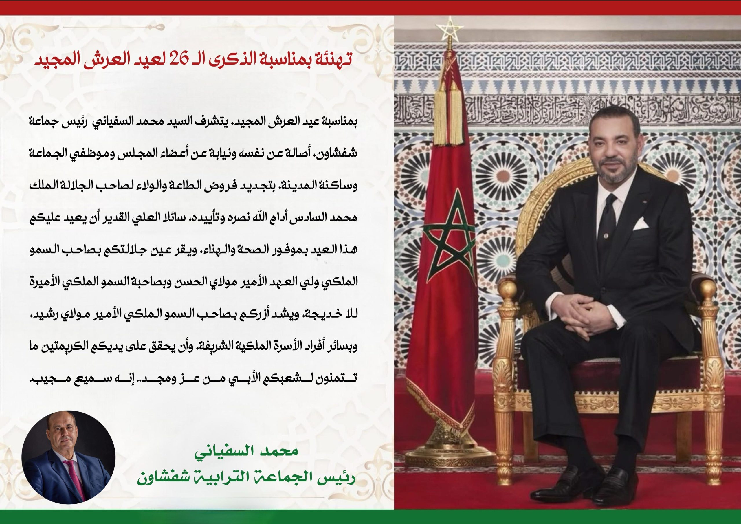 El presidente de la comunidad de Chefchaouen, Mohamed Al-Safiani, ha renovado los votos de lealtad a Su Majestad el Rey Mohammed VI en este importante día. Con un mensaje conmovedor, Al-Safiani destaca la importancia de la obediencia y el respaldo al rey, así como el deseo de prosperidad para Marruecos.